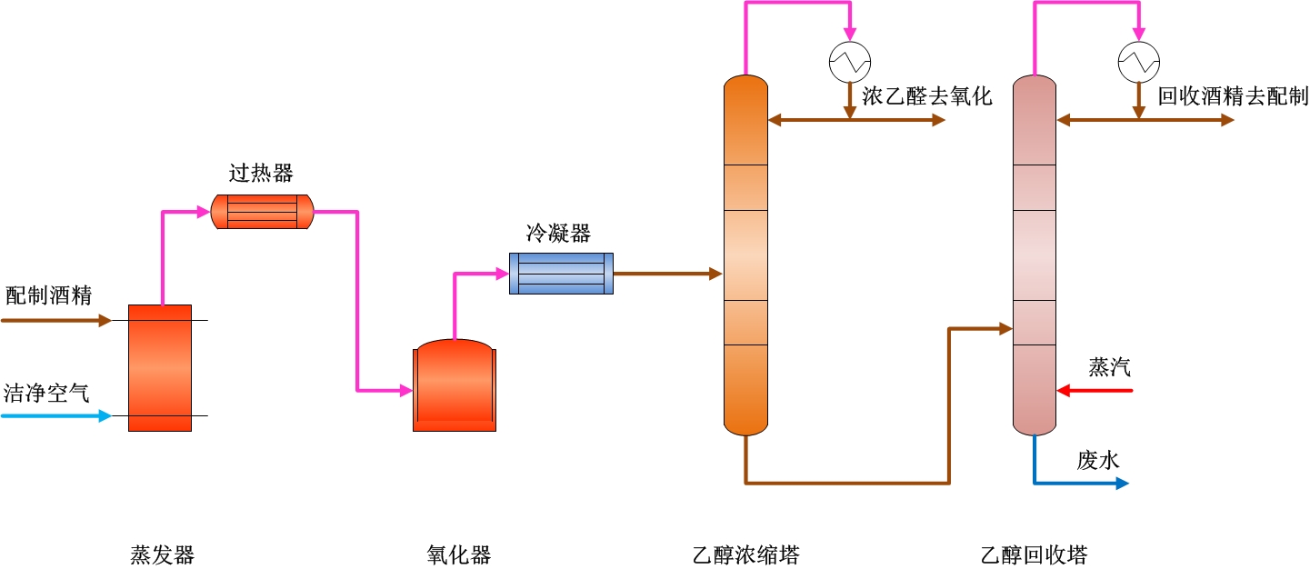 配制好的酒精送入蒸發器蒸發,同時加入空氣,出蒸發器的氣相混合物經過熱后進入氧化器,在催化銀的作用下,乙醇轉化為乙醛,乙醛冷凝后進入乙醛濃縮塔,濃縮后的濃乙醛去乙醛氧化工序使用,未反應的乙醇通過回收塔回收返回乙醇配制間。