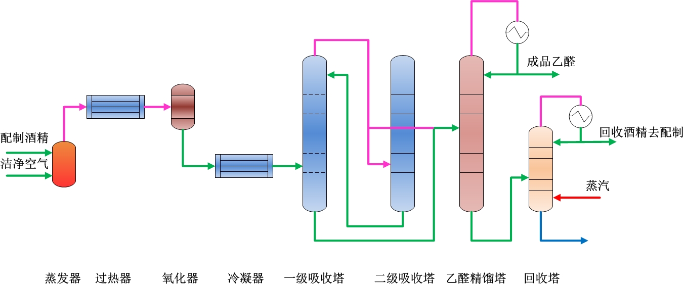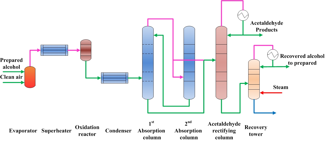 配制好的酒精送入蒸發器蒸發,同時加入空氣,蒸發器出來的混合氣體經過熱后進入氧化器,在催化劑作用下,乙醇轉化為乙醛,反應氣體冷凝后再經過第一吸收塔和第二吸收塔組成的系統得到稀乙醛。稀乙醛經預熱后進入乙醛精餾塔中部,塔頂醛汽經冷卻后一部分回流,一部分成為成品乙醛。未反應的乙醇通過回收塔回收返回乙醇配制槽。